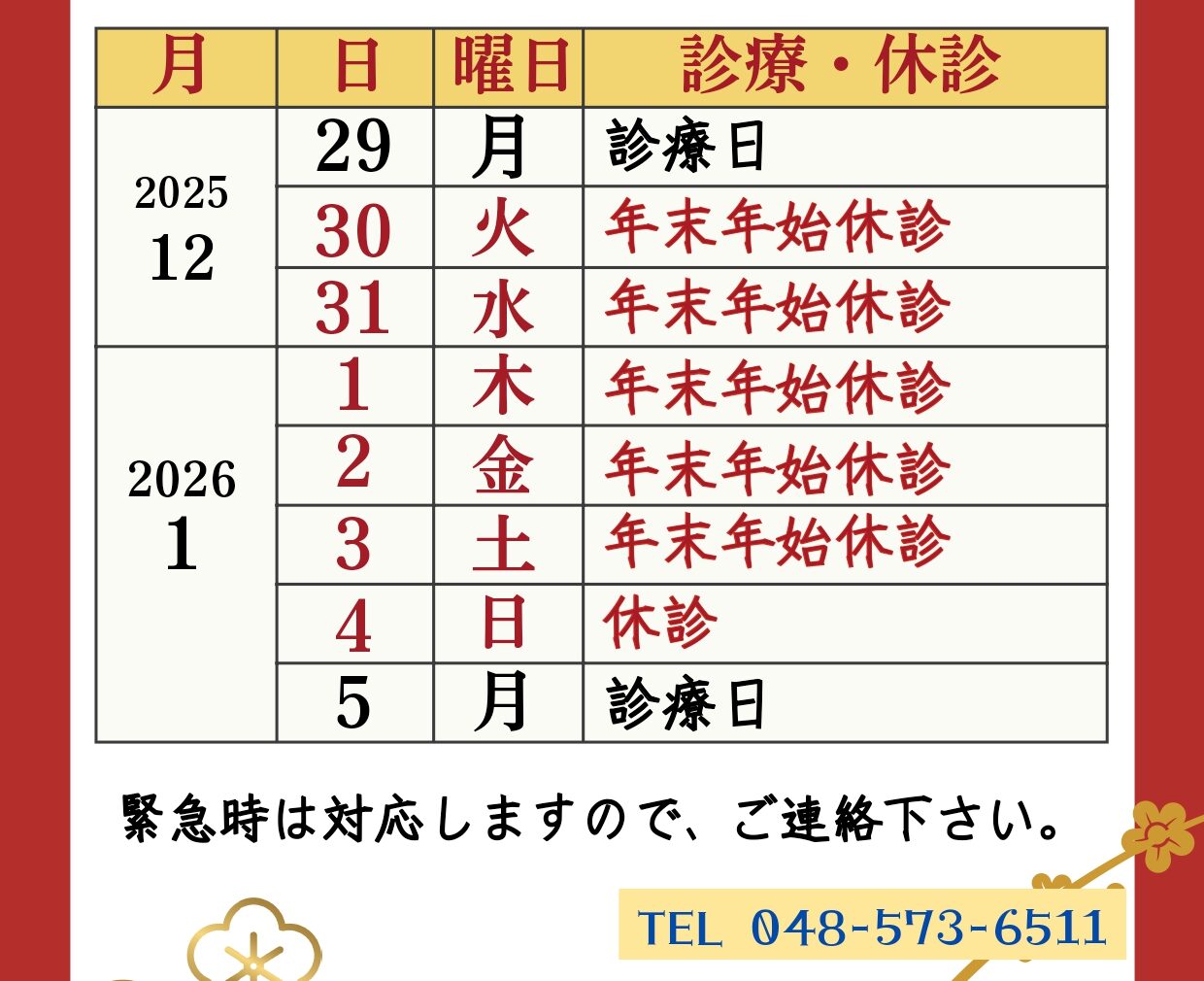 お知らせお知らせ一覧 > 年末年始の診療・休診予定について NEW! 重要 2025.11.26 令和7年末から令和8年始の当院の診療と休診の予定についてお知らせします。 令和7年12月29日(月)診療(終日)が今年最後の診療日です。 12月30日(火)から令和8年 1月 4日(日)の期間、休診します。 来年の令和8年は 1月 5日(月)から診療を開始予定です。 休診中も可能な範囲で電話による対応や急病やケガに対応いたします。場合によっては休日診療所等をご案内することもあります。当院代表電話048-573-6511にご連絡ください。 <前の記事 次の記事>